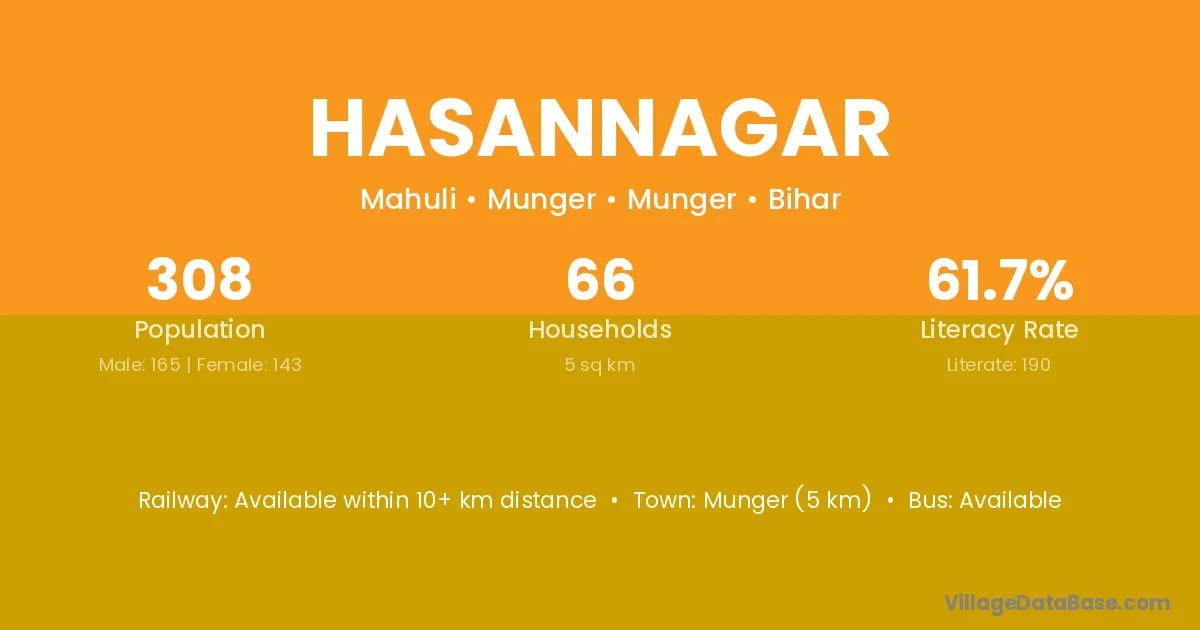 The literacy rate of Hasannagar village is 56.52%. Male literacy stands at 72.27% and female literacy at 39.59%.