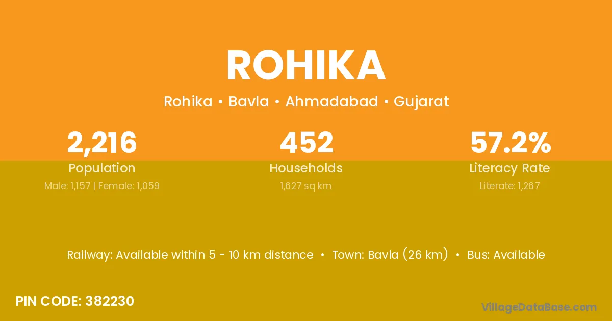 Bavla (26 km) is the nearest town to Rohika village for major economic activities and is located approximately 26 km away.