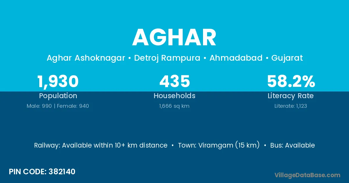 Viramgam (15 km) is the nearest town to Aghar village for major economic activities and is located approximately 15 km away.