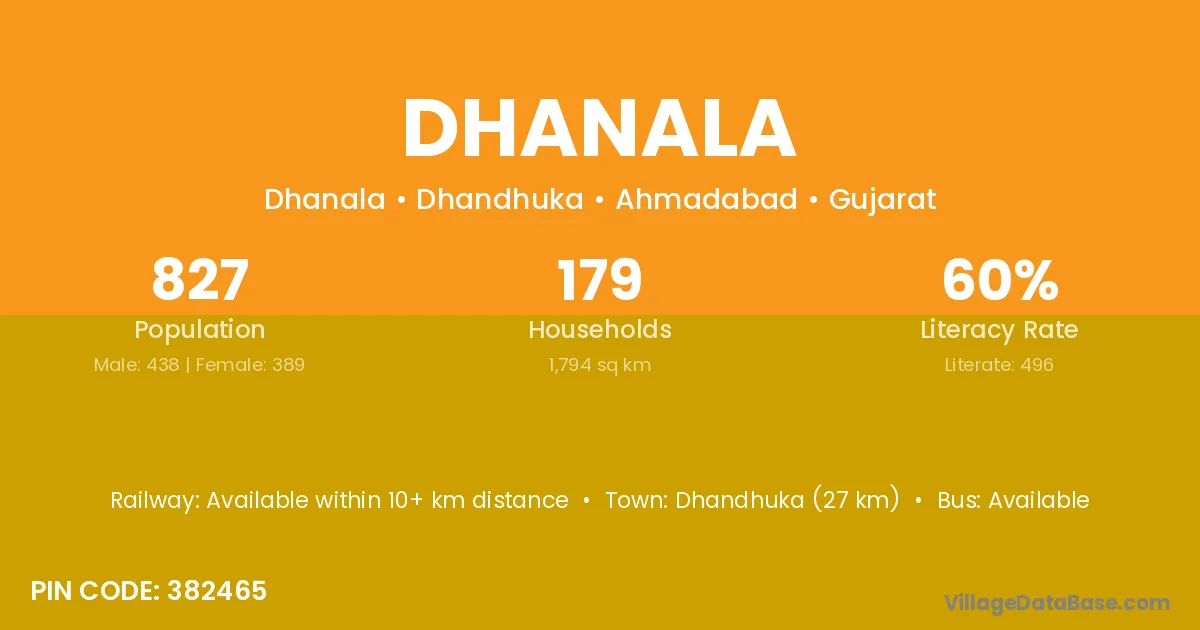 Dhandhuka (27 km) is the nearest town to Dhanala village for major economic activities and is located approximately 27 km away.