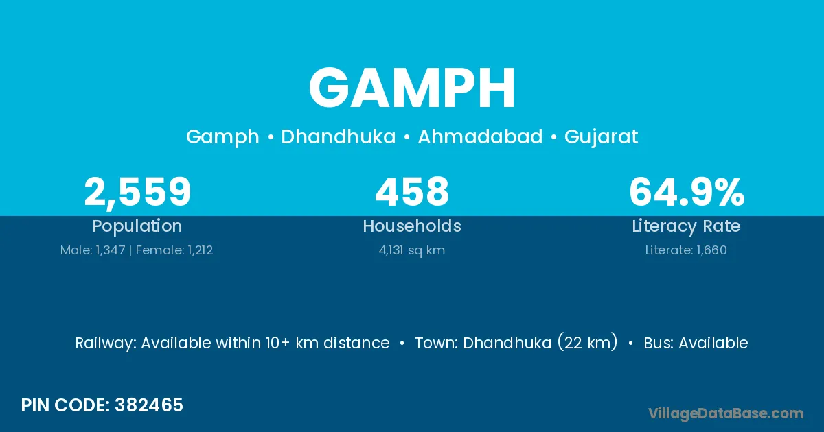Dhandhuka (22 km) is the nearest town to Gamph village for major economic activities and is located approximately 22 km away.