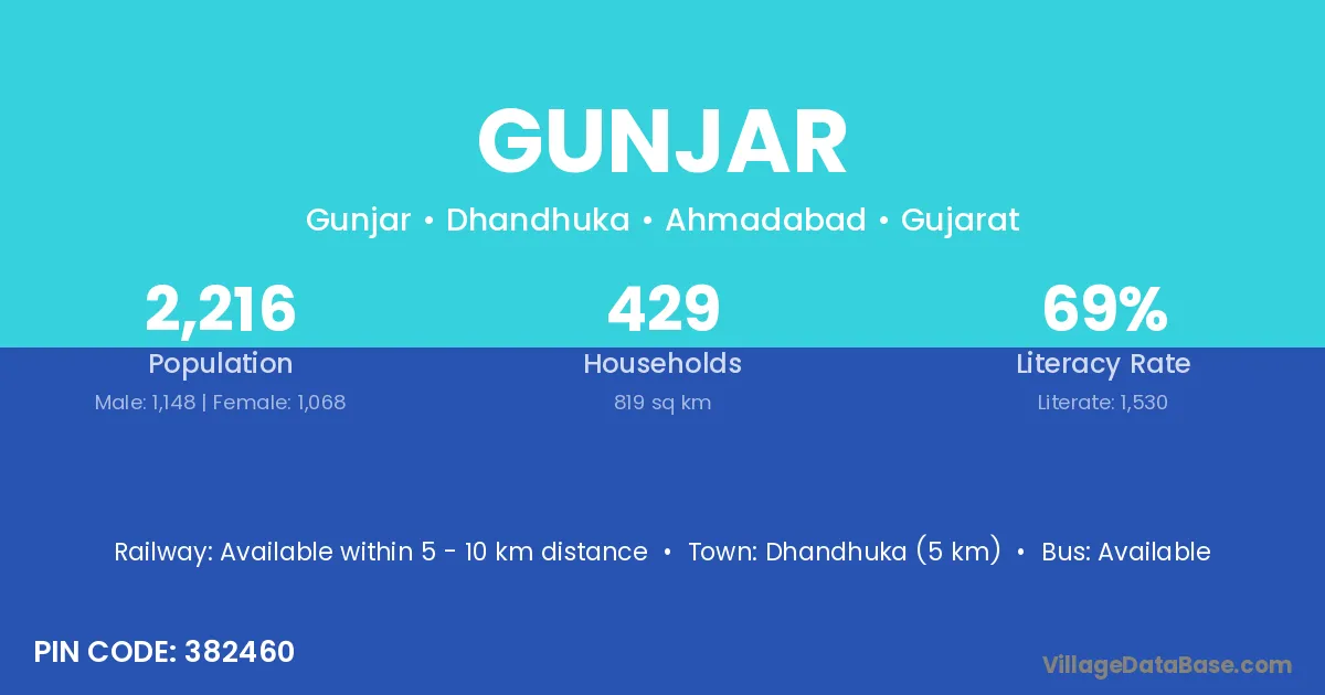 Dhandhuka (5 km) is the nearest town to Gunjar village for major economic activities and is located approximately 5 km away.