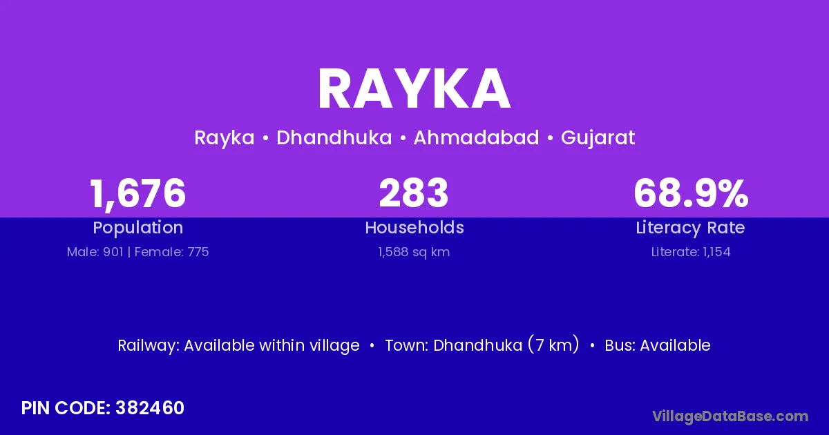 Dhandhuka (7 km) is the nearest town to Rayka village for major economic activities and is located approximately 7 km away.
