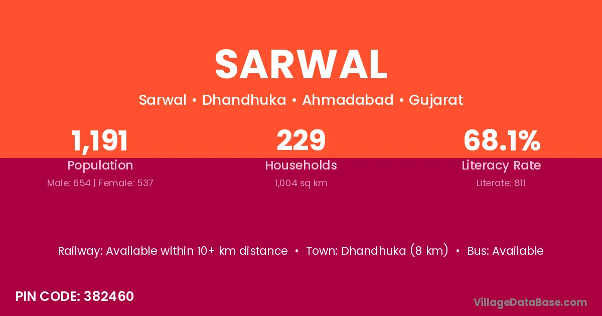 Dhandhuka (8 km) is the nearest town to Sarwal village for major economic activities and is located approximately 8 km away.