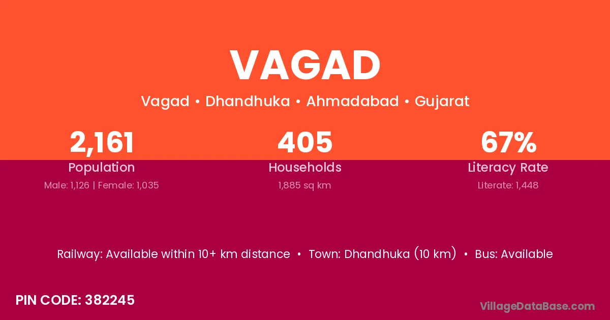 Dhandhuka (10 km) is the nearest town to Vagad village for major economic activities and is located approximately 10 km away.