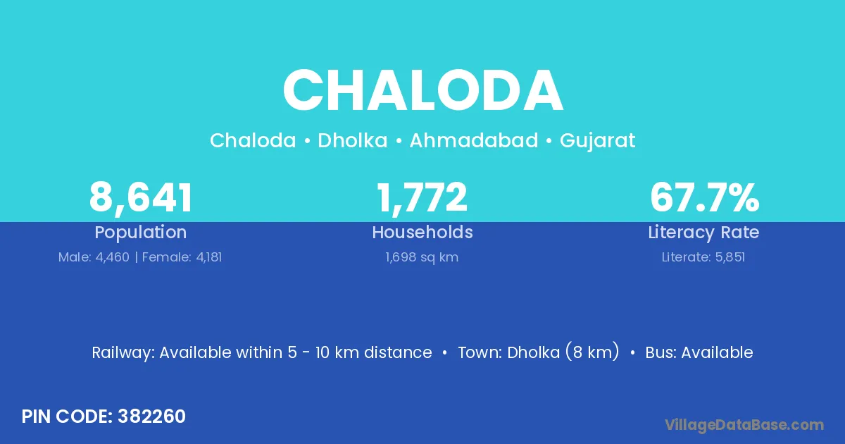Dholka (8 km) is the nearest town to Chaloda village for major economic activities and is located approximately 8 km away.