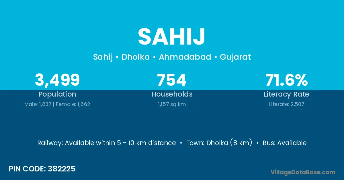 Dholka (8 km) is the nearest town to Sahij village for major economic activities and is located approximately 8 km away.