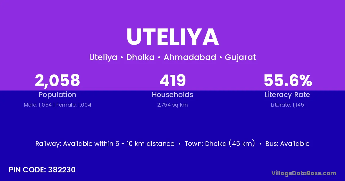 Dholka (45 km) is the nearest town to Uteliya village for major economic activities and is located approximately 45 km away.