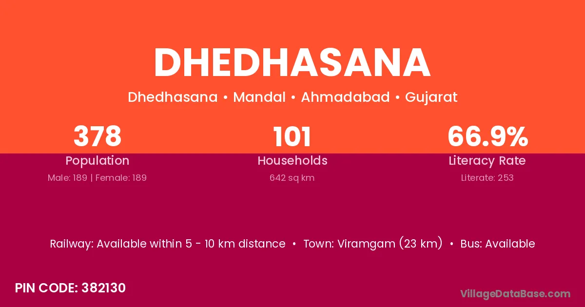 Dhedhasana village has a total population of 378 people, of which 189 are males and 189 are females.