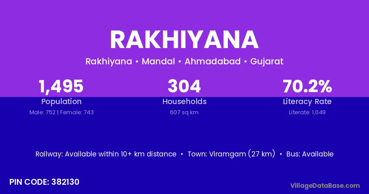 Viramgam (27 km) is the nearest town to Rakhiyana village for major economic activities and is located approximately 27 km away.