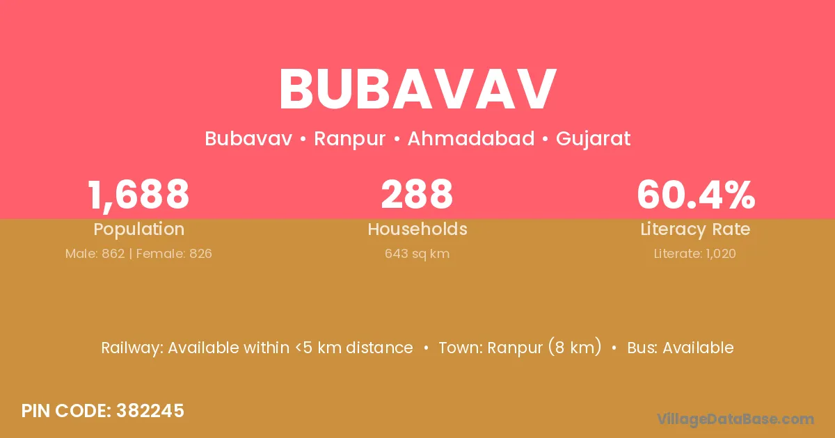 Ranpur (8 km) is the nearest town to Bubavav village for major economic activities and is located approximately 8 km away.