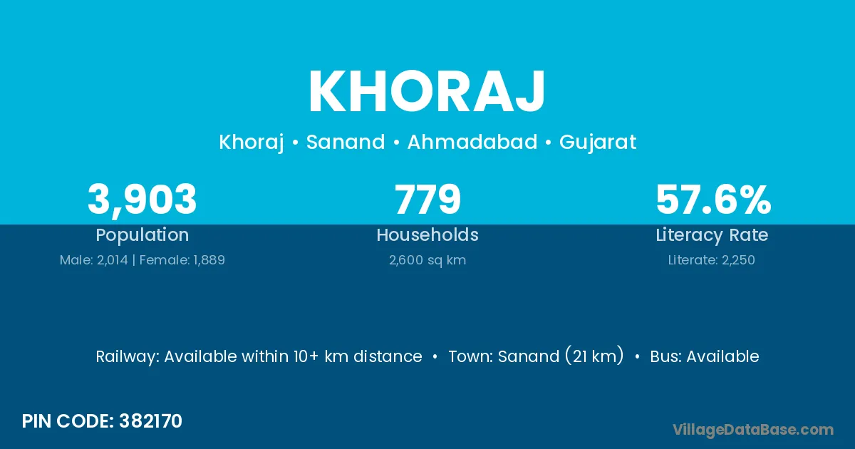 Sanand (21 km) is the nearest town to Khoraj village for major economic activities and is located approximately 21 km away.