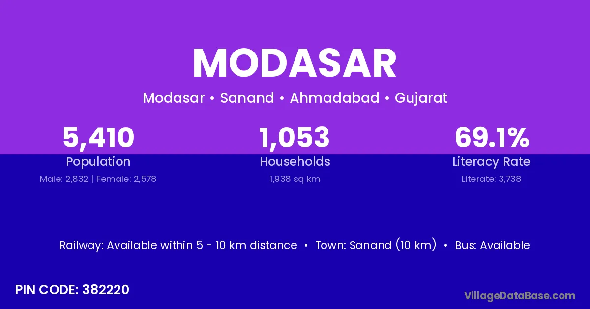 Sanand (10 km) is the nearest town to Modasar village for major economic activities and is located approximately 10 km away.