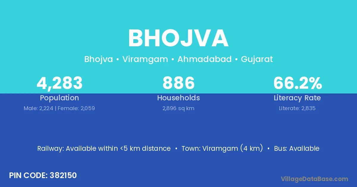Viramgam (4 km) is the nearest town to Bhojva village for major economic activities and is located approximately 4 km away.
