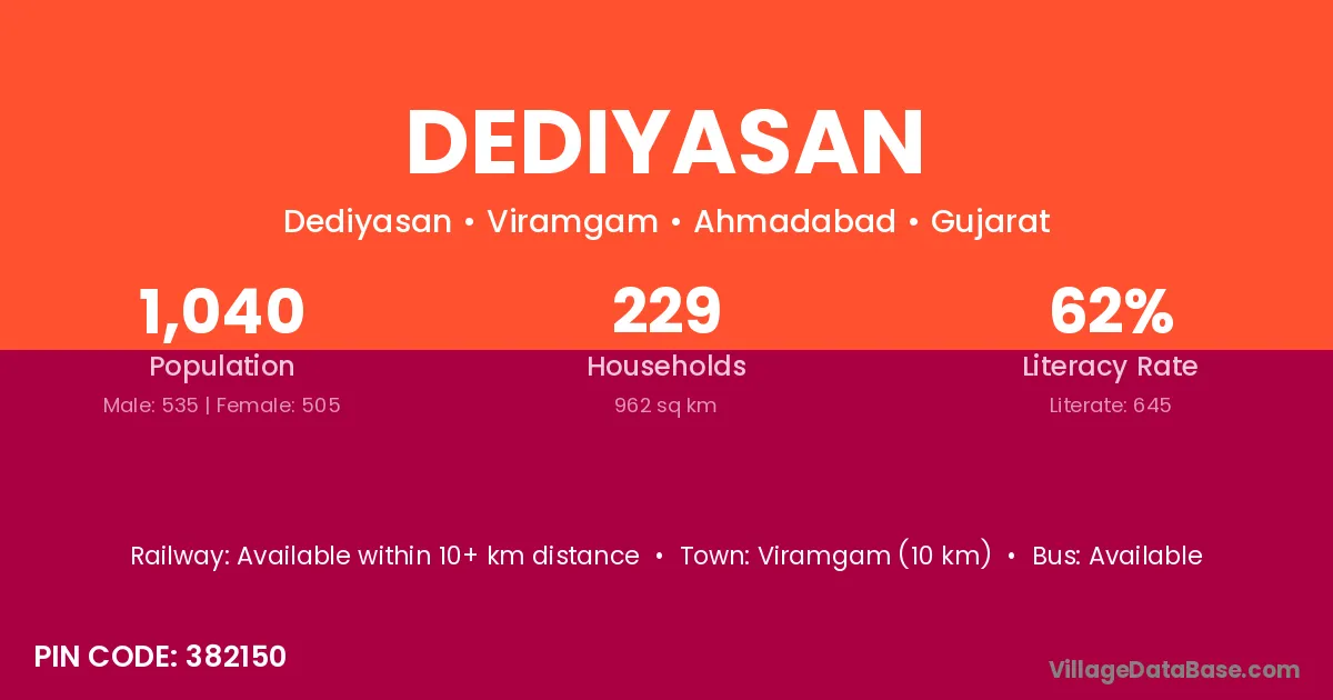 Viramgam (10 km) is the nearest town to Dediyasan village for major economic activities and is located approximately 10 km away.