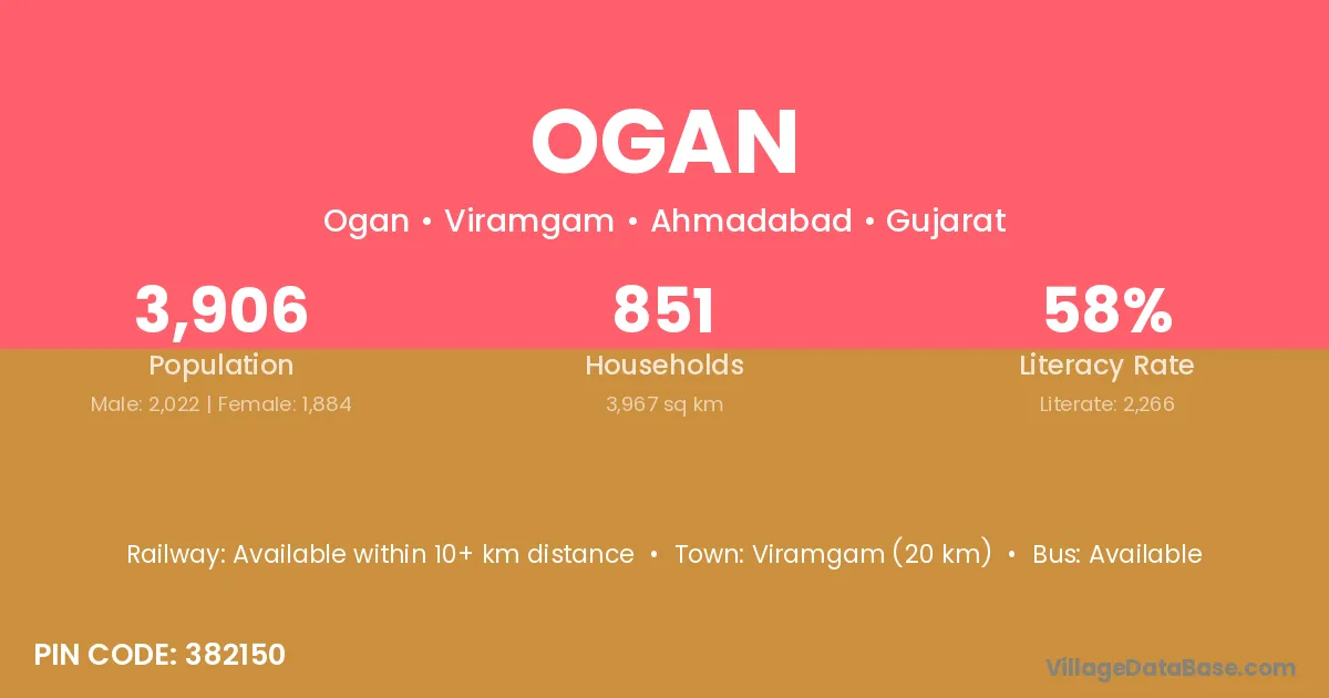 Viramgam (20 km) is the nearest town to Ogan village for major economic activities and is located approximately 20 km away.