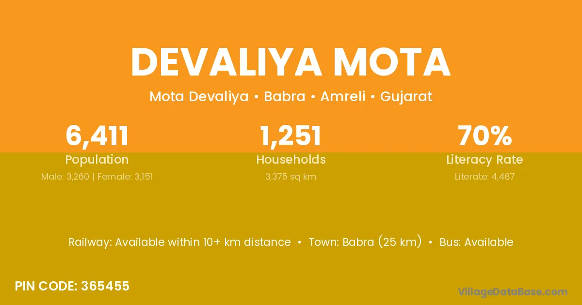 Babra (25 km) is the nearest town to Devaliya Mota village for major economic activities and is located approximately 25 km away.