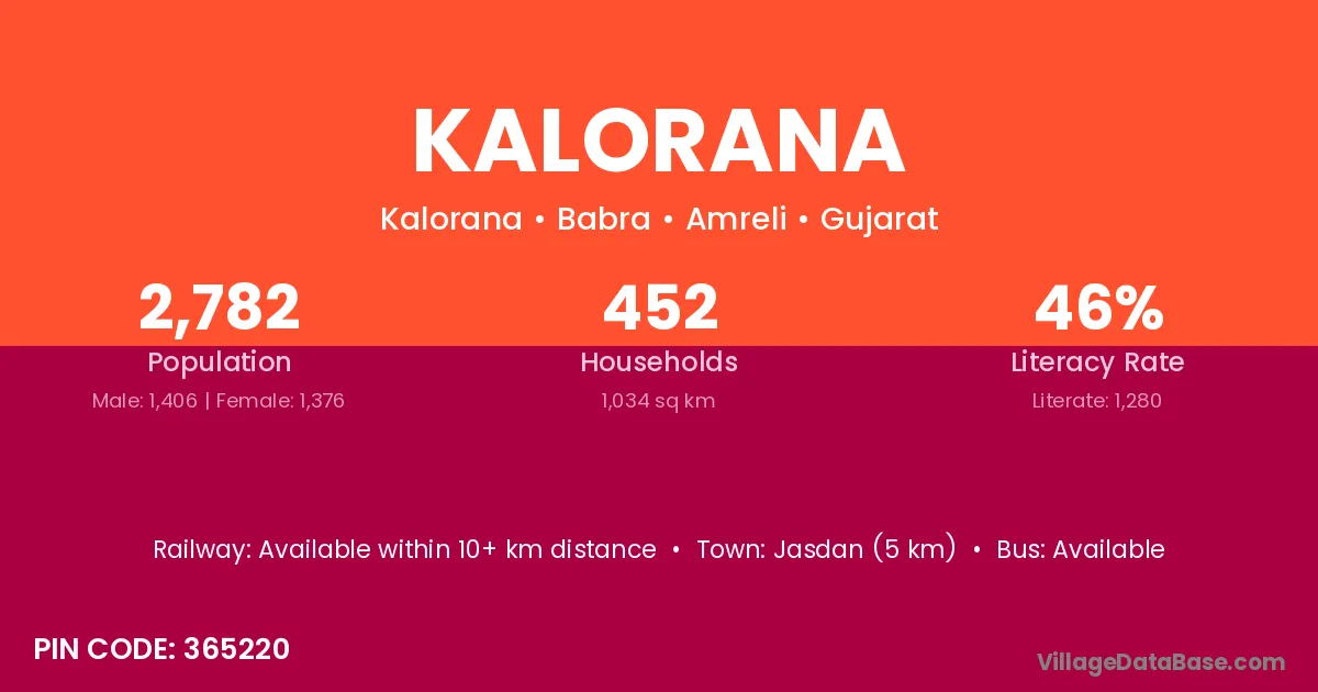 Jasdan (5 km) is the nearest town to Kalorana village for major economic activities and is located approximately 5 km away.