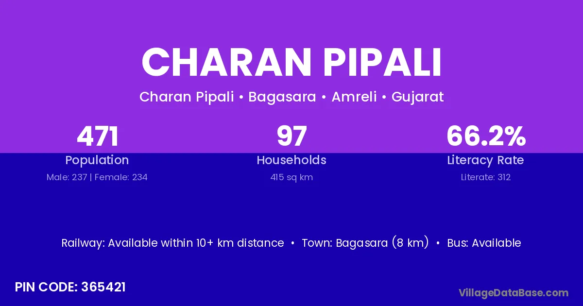 Bagasara (8 km) is the nearest town to Charan Pipali village for major economic activities and is located approximately 8 km away.