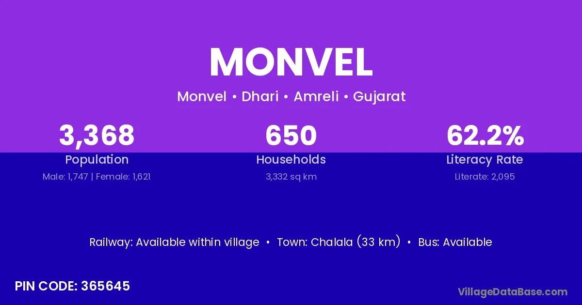 Chalala (33 km) is the nearest town to Monvel village for major economic activities and is located approximately 33 km away.