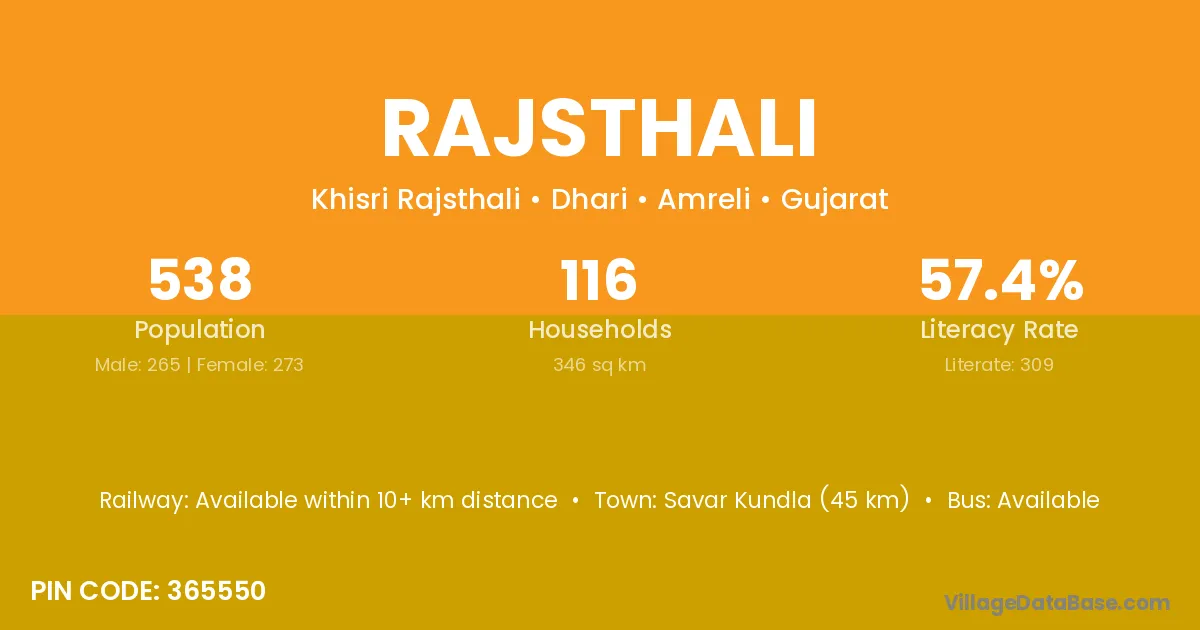 Savar Kundla (45 km) is the nearest town to Rajsthali village for major economic activities and is located approximately 45 km away.