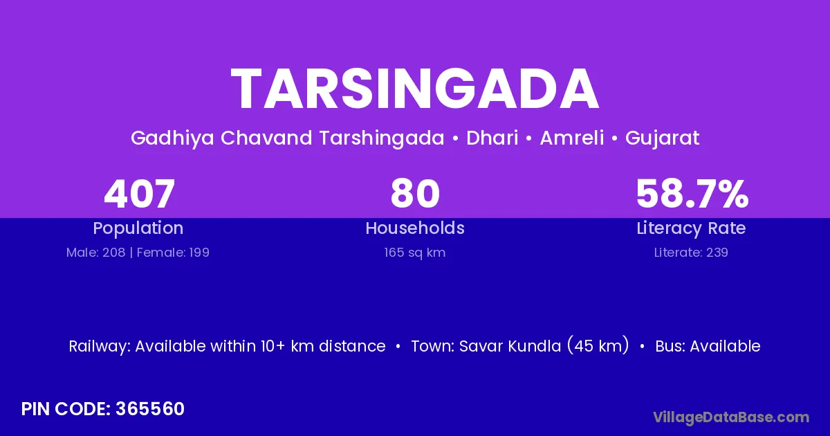Savar Kundla (45 km) is the nearest town to Tarsingada village for major economic activities and is located approximately 45 km away.