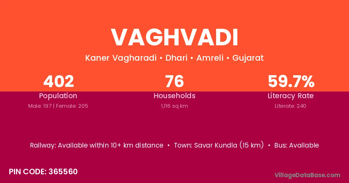 Savar Kundla (15 km) is the nearest town to Vaghvadi village for major economic activities and is located approximately 15 km away.