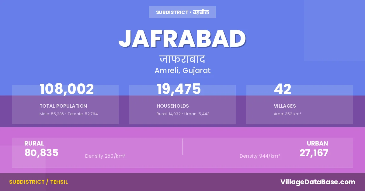 According to the 2011 census The total area of Jafrabad Taluka is 352 km², with a population of 108002 people. The population density is 307 inhabitants per square kilometre, and there are approximately 19475 houses in the sub district.
