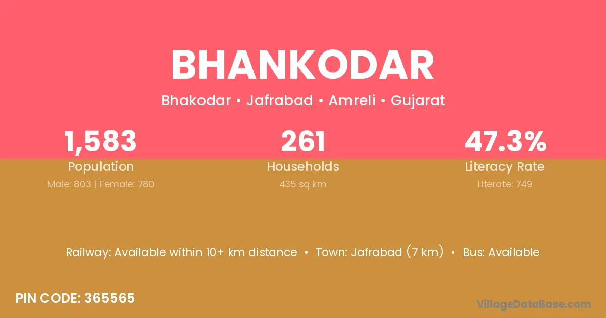 Jafrabad (7 km) is the nearest town to Bhankodar village for major economic activities and is located approximately 7 km away.