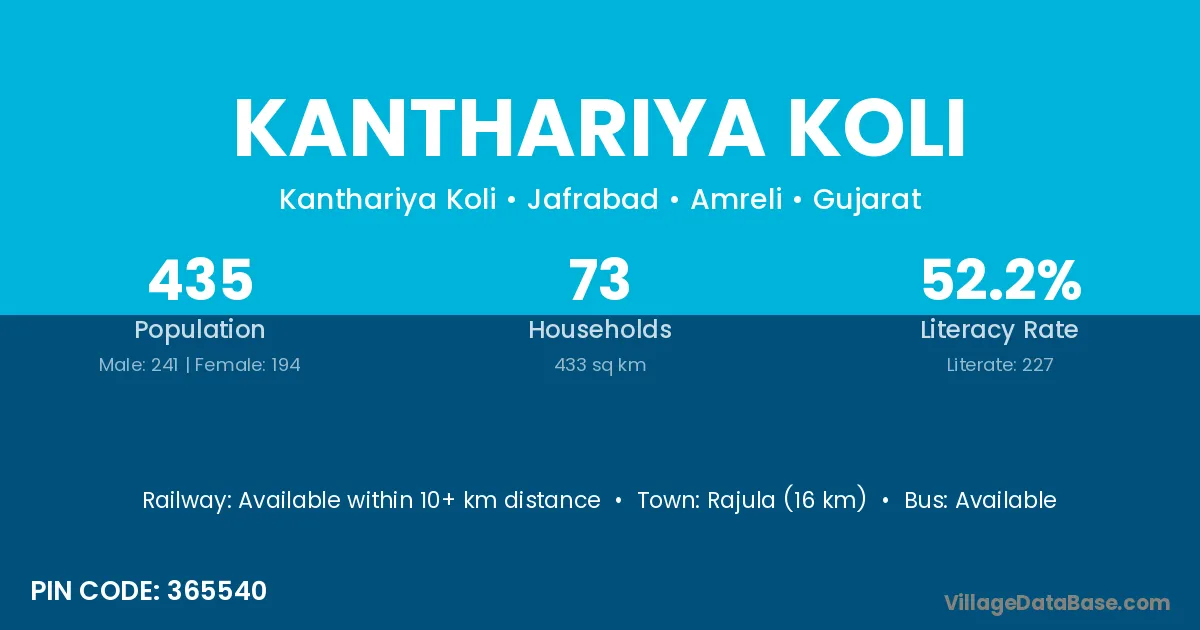 Rajula (16 km) is the nearest town to Kanthariya Koli village for major economic activities and is located approximately 16 km away.