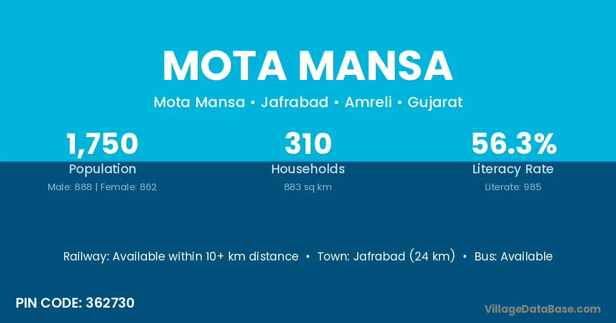 Jafrabad (24 km) is the nearest town to Mota Mansa village for major economic activities and is located approximately 24 km away.