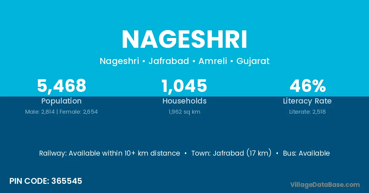 Jafrabad (17 km) is the nearest town to Nageshri village for major economic activities and is located approximately 17 km away.