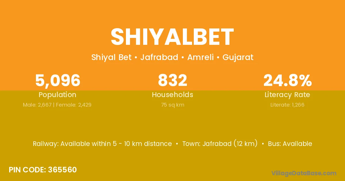 Jafrabad (12 km) is the nearest town to Shiyalbet village for major economic activities and is located approximately 12 km away.