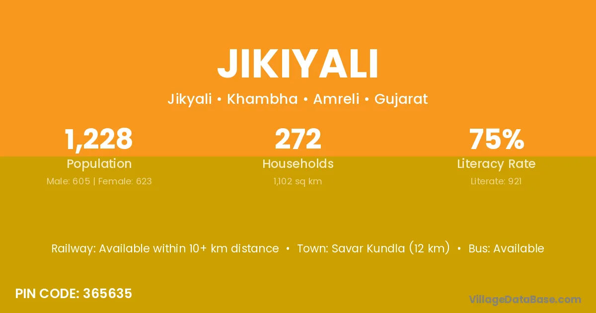 Savar Kundla (12 km) is the nearest town to Jikiyali village for major economic activities and is located approximately 12 km away.