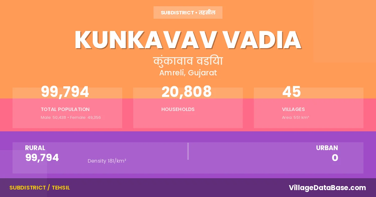 According to the 2011 census The total area of Kunkavav Vadia Taluka is 551 km², with a population of 99794 people. The population density is 181 inhabitants per square kilometre, and there are approximately 20808 houses in the sub district.