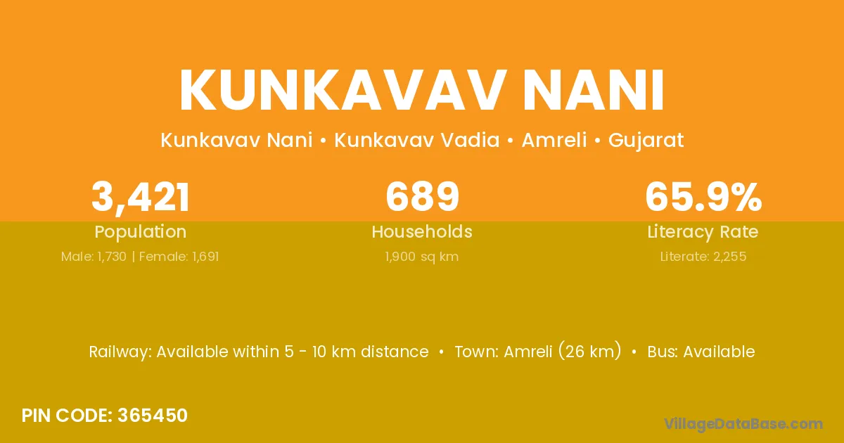 Amreli (26 km) is the nearest town to Kunkavav Nani village for major economic activities and is located approximately 26 km away.