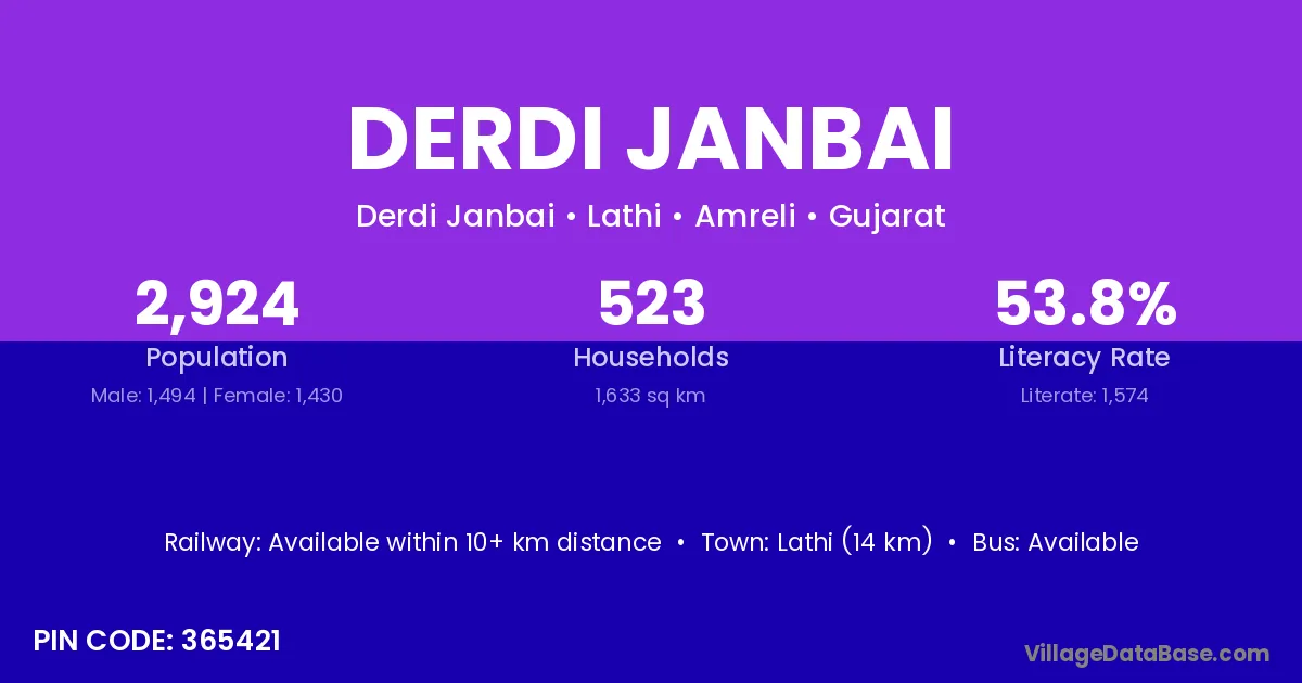 Lathi (14 km) is the nearest town to Derdi Janbai village for major economic activities and is located approximately 14 km away.