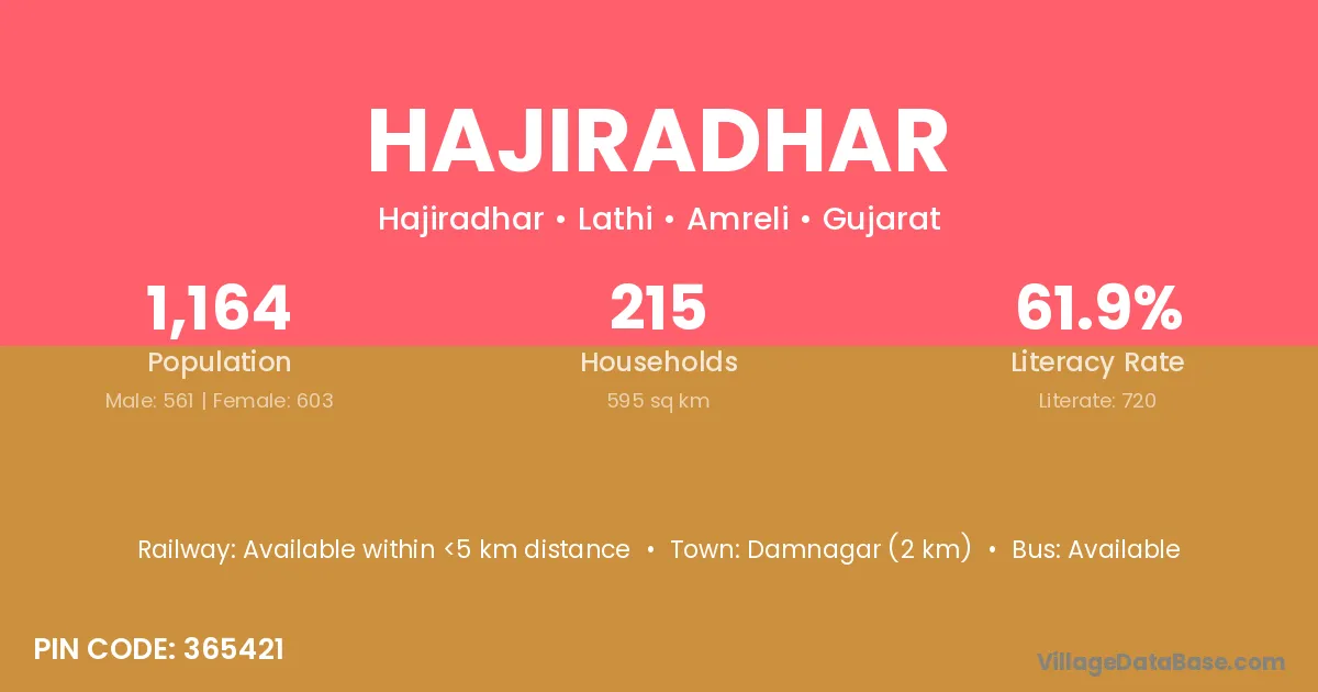 Damnagar (2 km) is the nearest town to Hajiradhar village for major economic activities and is located approximately 2 km away.