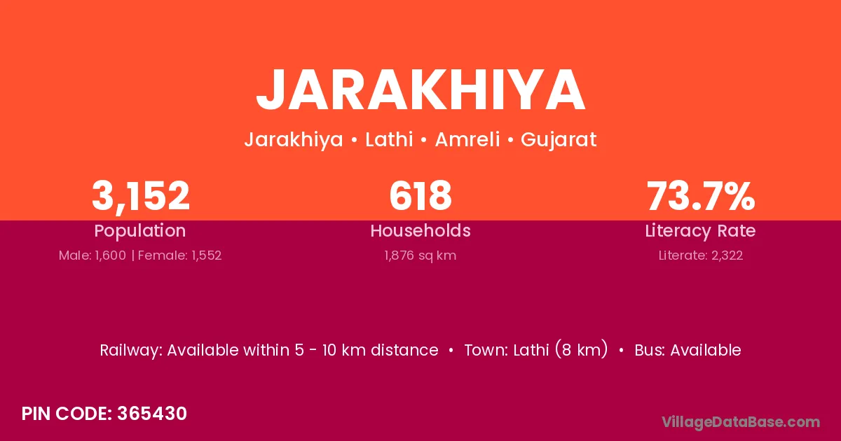 Lathi (8 km) is the nearest town to Jarakhiya village for major economic activities and is located approximately 8 km away.