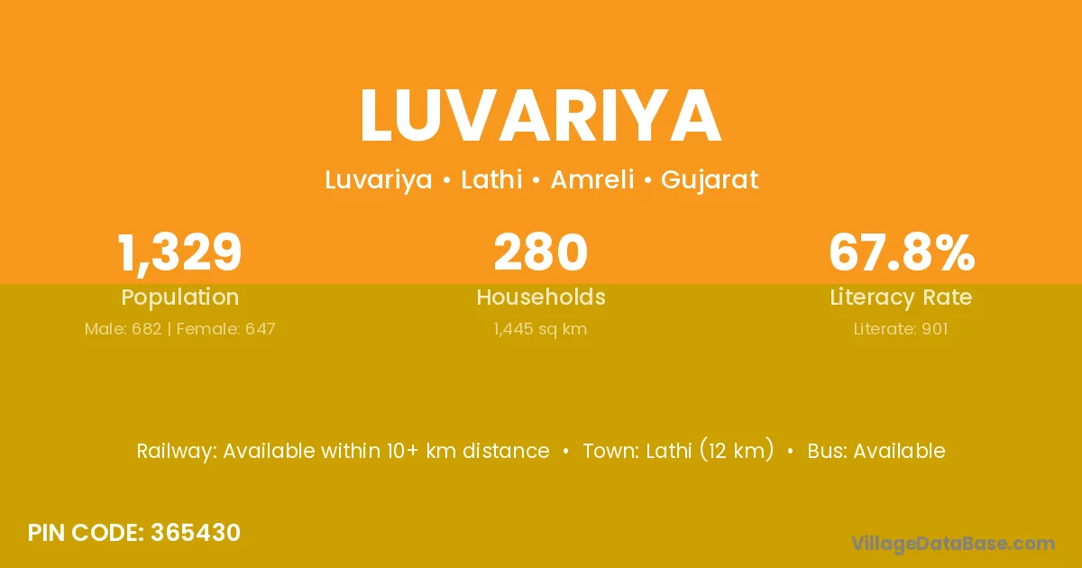 Lathi (12 km) is the nearest town to Luvariya village for major economic activities and is located approximately 12 km away.