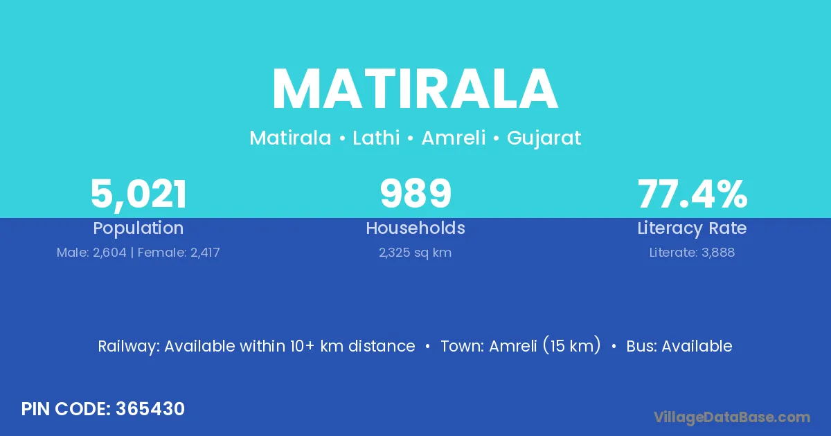 Amreli (15 km) is the nearest town to Matirala village for major economic activities and is located approximately 15 km away.