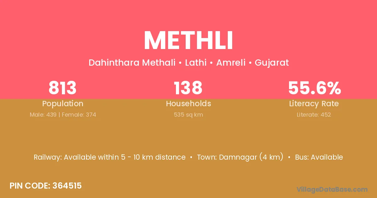 Damnagar (4 km) is the nearest town to Methli village for major economic activities and is located approximately 4 km away.