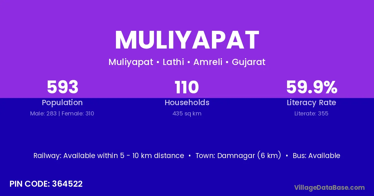 Damnagar (6 km) is the nearest town to Muliyapat village for major economic activities and is located approximately 6 km away.