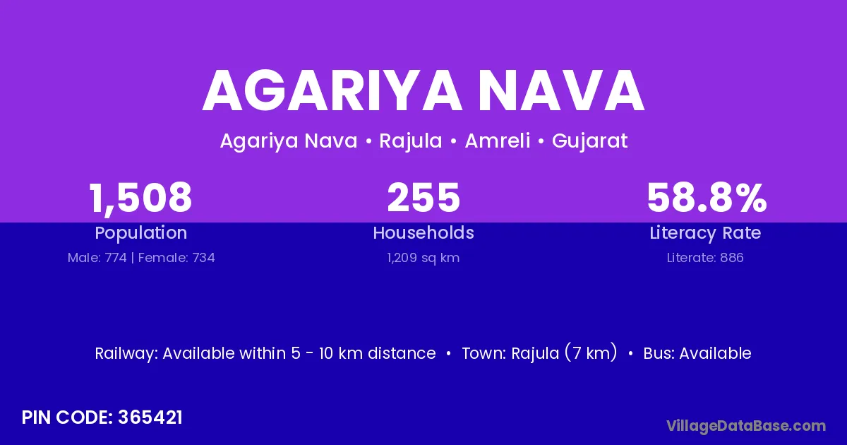 Rajula (7 km) is the nearest town to Agariya Nava village for major economic activities and is located approximately 7 km away.