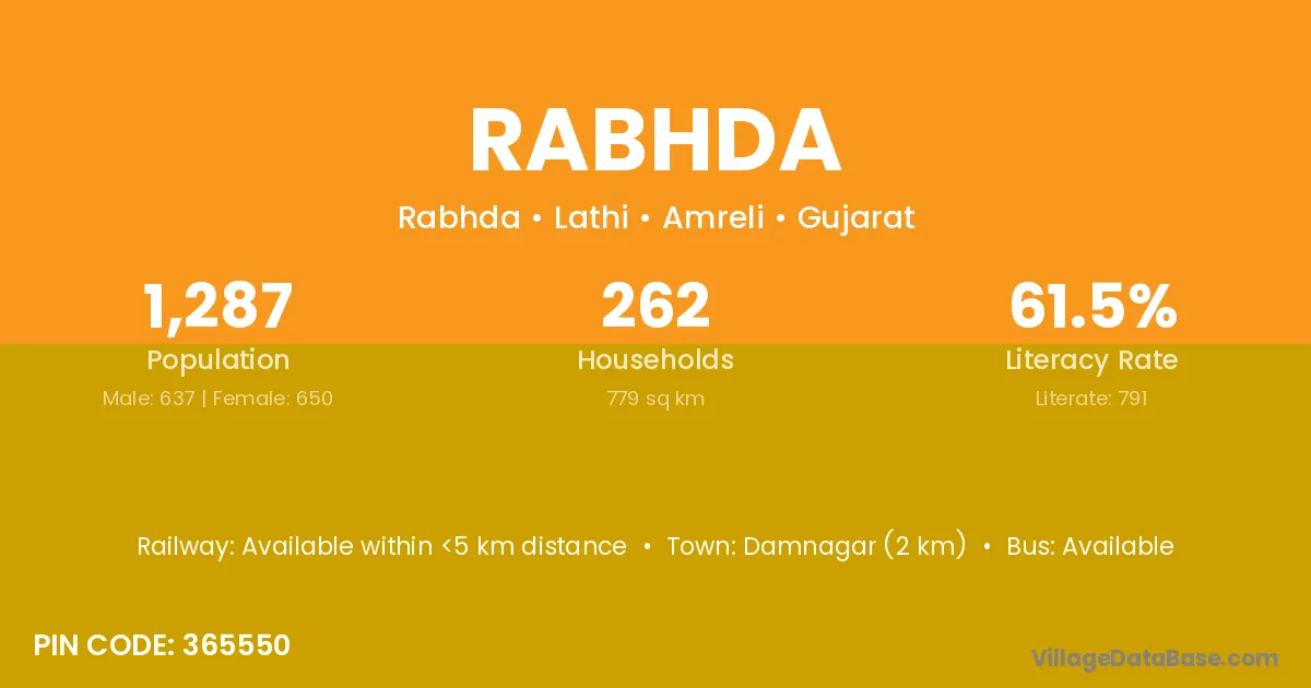 Mahuva (20 km) is the nearest town to Rabhda village for major economic activities and is located approximately 20 km away.