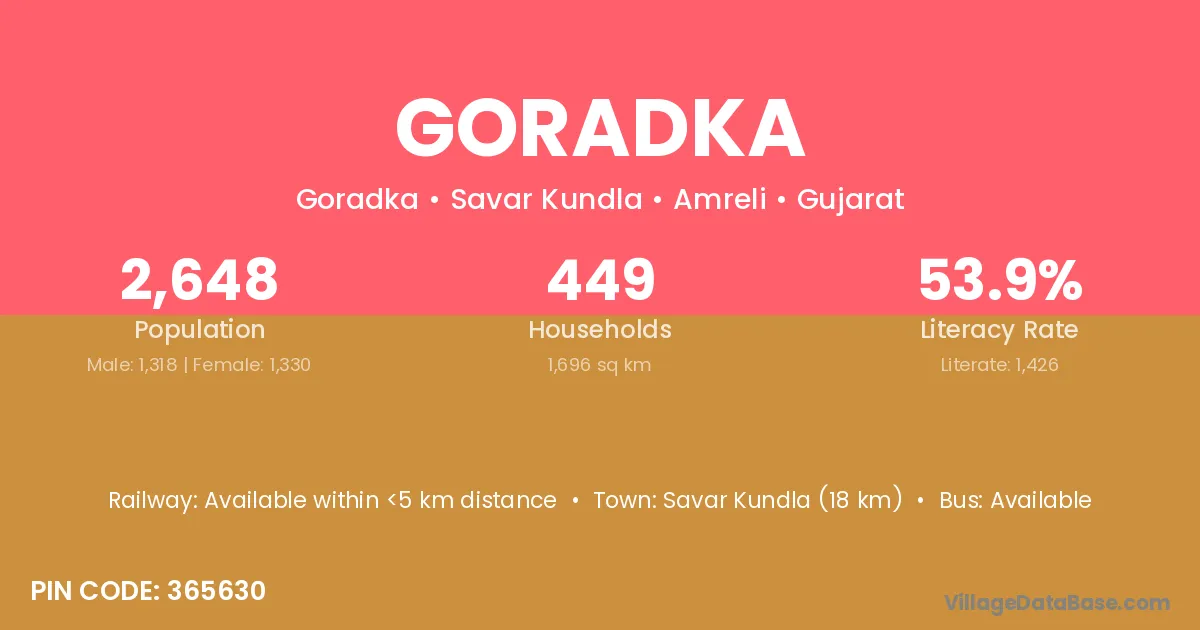 Savar Kundla (18 km) is the nearest town to Goradka village for major economic activities and is located approximately 18 km away.