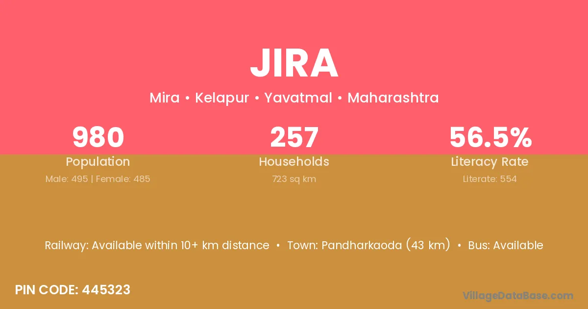 Jira village has a total population of 1,921 people, of which 983 are males and 938 are females.