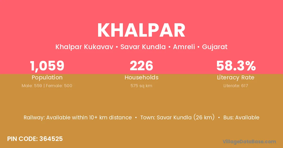 Savar Kundla (26 km) is the nearest town to Khalpar village for major economic activities and is located approximately 26 km away.