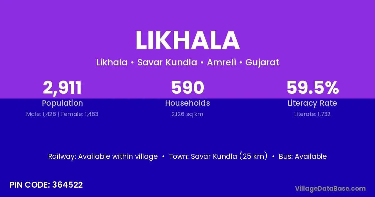 Savar Kundla (25 km) is the nearest town to Likhala village for major economic activities and is located approximately 25 km away.