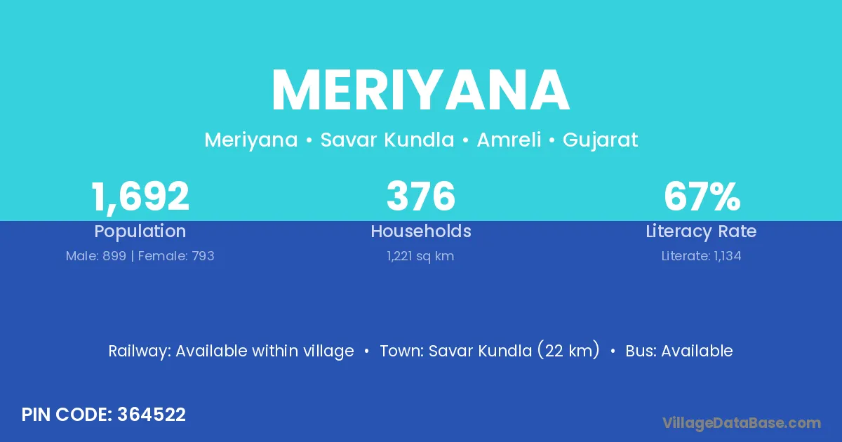 Savar Kundla (22 km) is the nearest town to Meriyana village for major economic activities and is located approximately 22 km away.